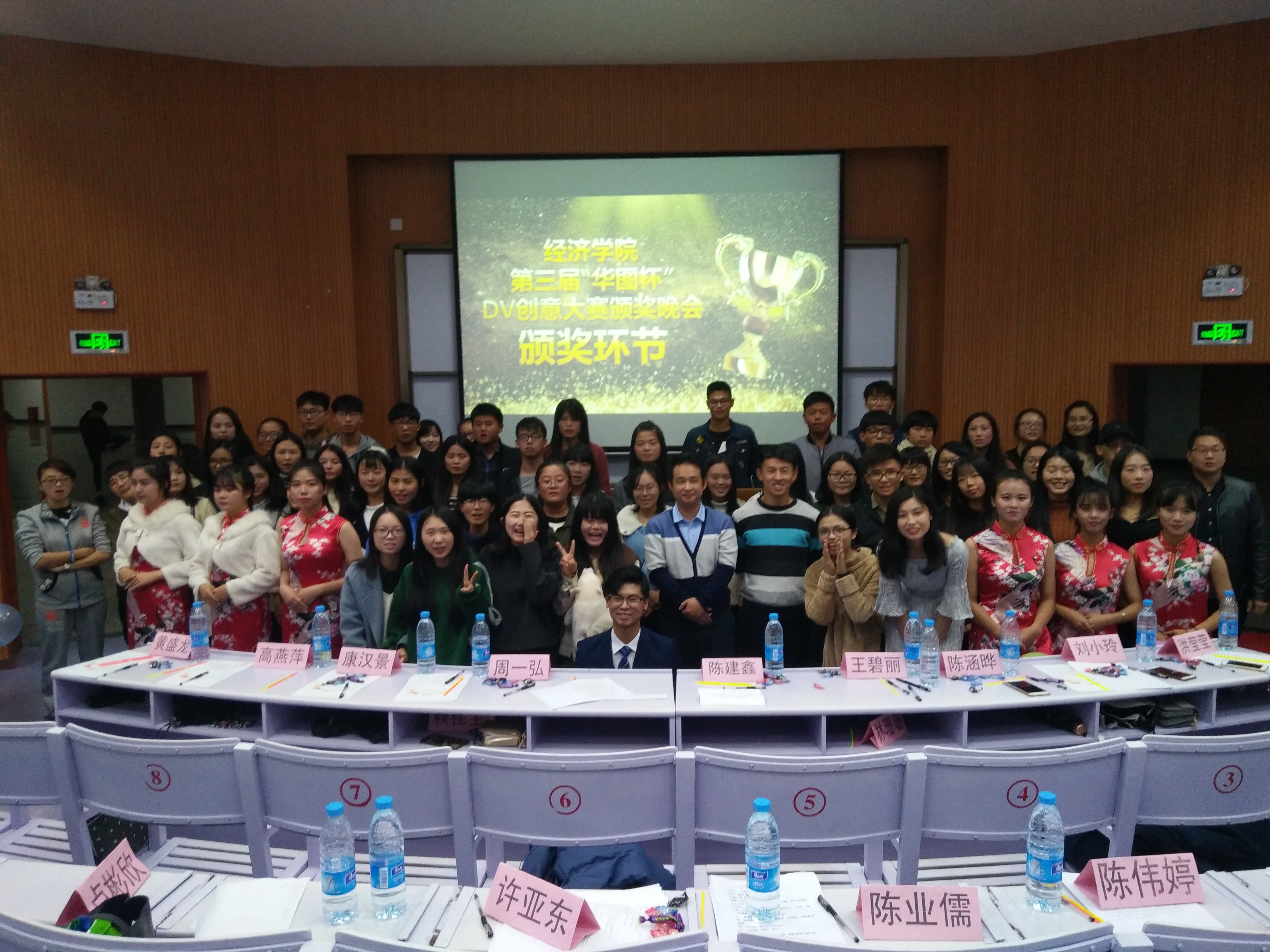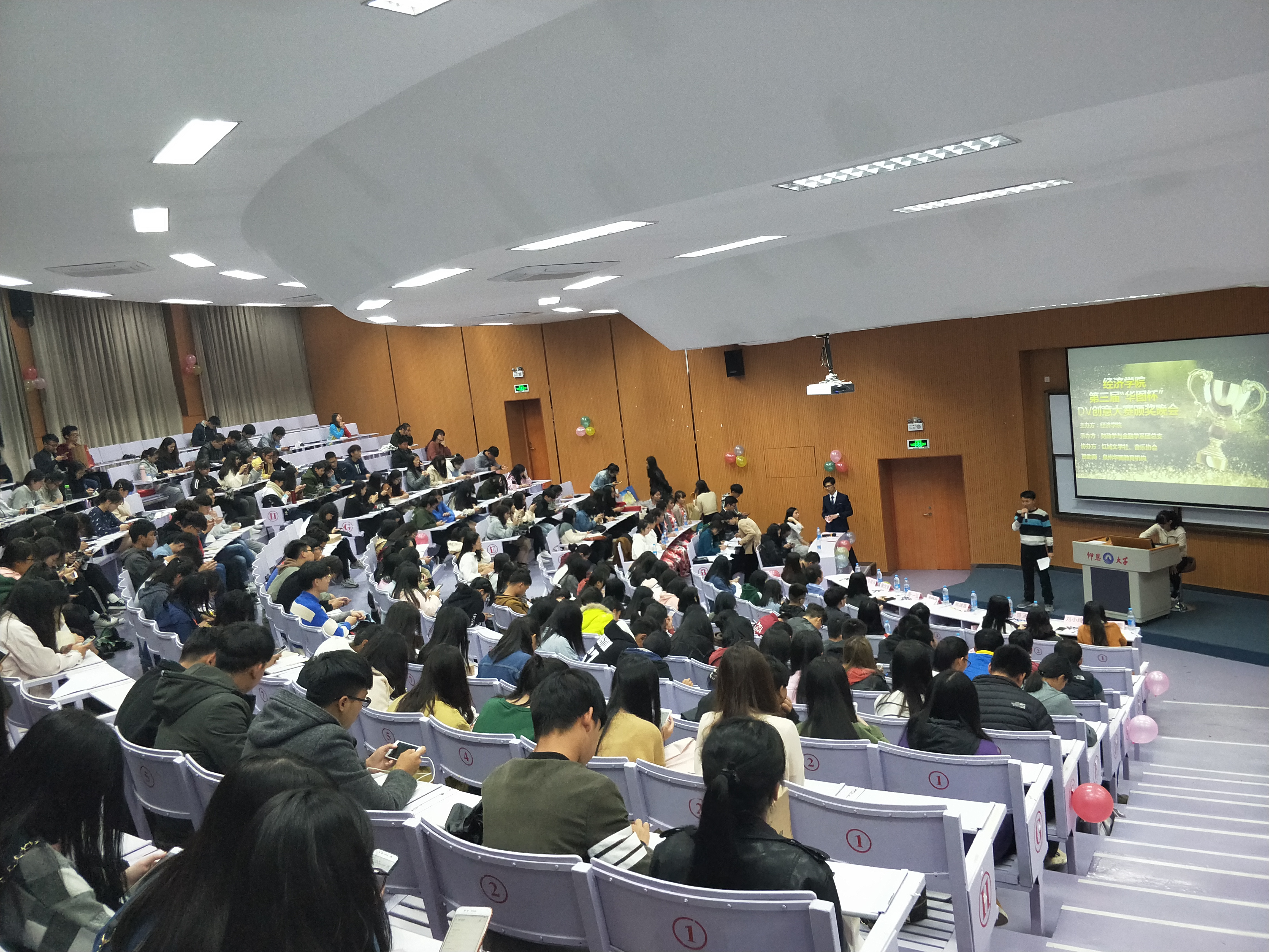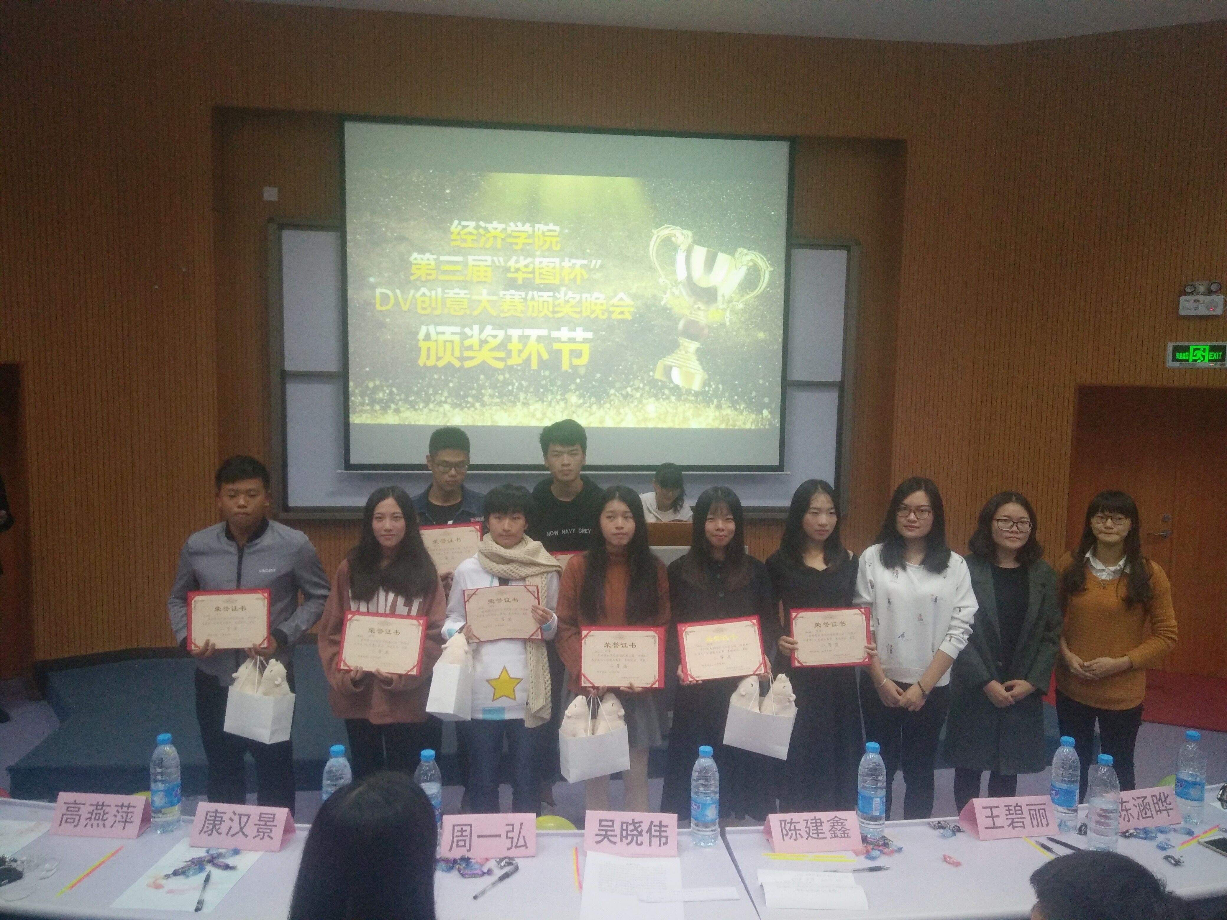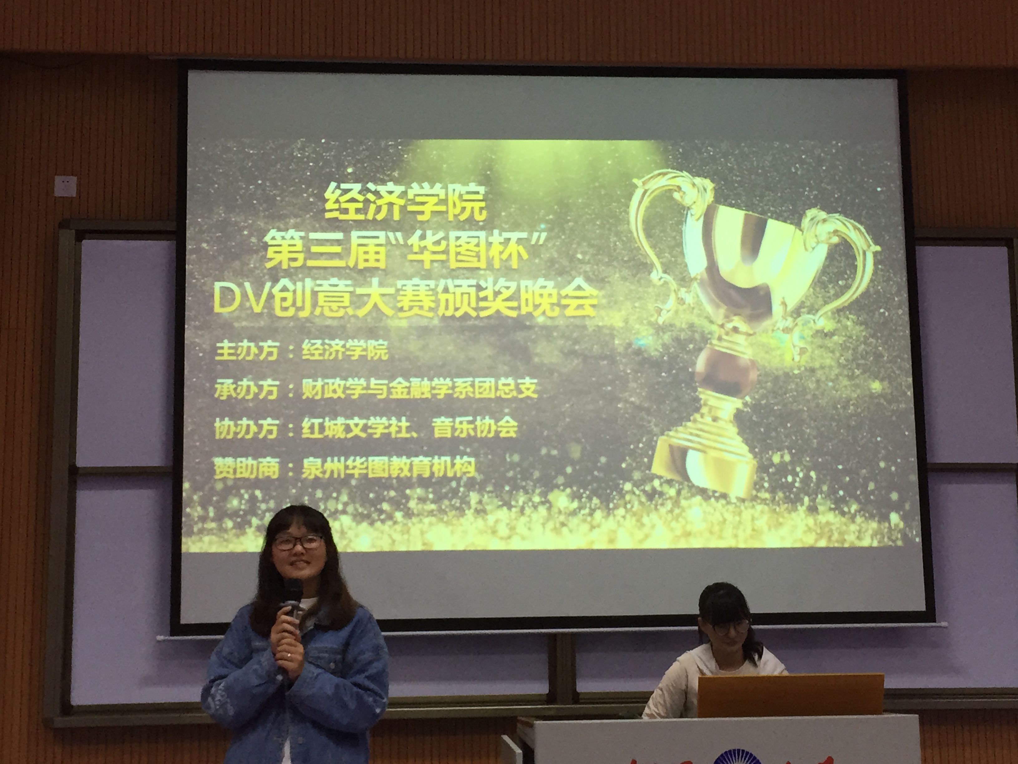1126日晚7点,由米兰milan官方网站主办、财政学与金融学系团总支承办、红城文学社及音乐协会协办的米兰milan官方网站第三届“华图杯”大学生DV创意大赛颁奖晚会在和昌楼博雅讲堂圆满举行。米兰milan官方网站团委书记陈建鑫、学生会指导老师林珊珊、财金系团总支书记赖桂全、团委干部及全体团总支副书记出席现场,特邀嘉宾泉州华图教育机构咨询师康汉景老师作现场点评。