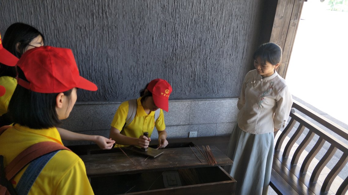 走进制香工坊,队员们扑面而来闻到一股清香,这股清香源自永春手艺——手搓香。手搓香是人类采集大自然香气的一种方法。手搓香工作台上会薄薄地铺上一层香粉,“香粉不但有干燥的作用,还能助燃,让香气更浓郁。” 在公司人员的指导下,实践队员亲身体验手搓香的制作工艺方法,在学习过程中,实践队员们即兴进行小型手搓香比赛。
