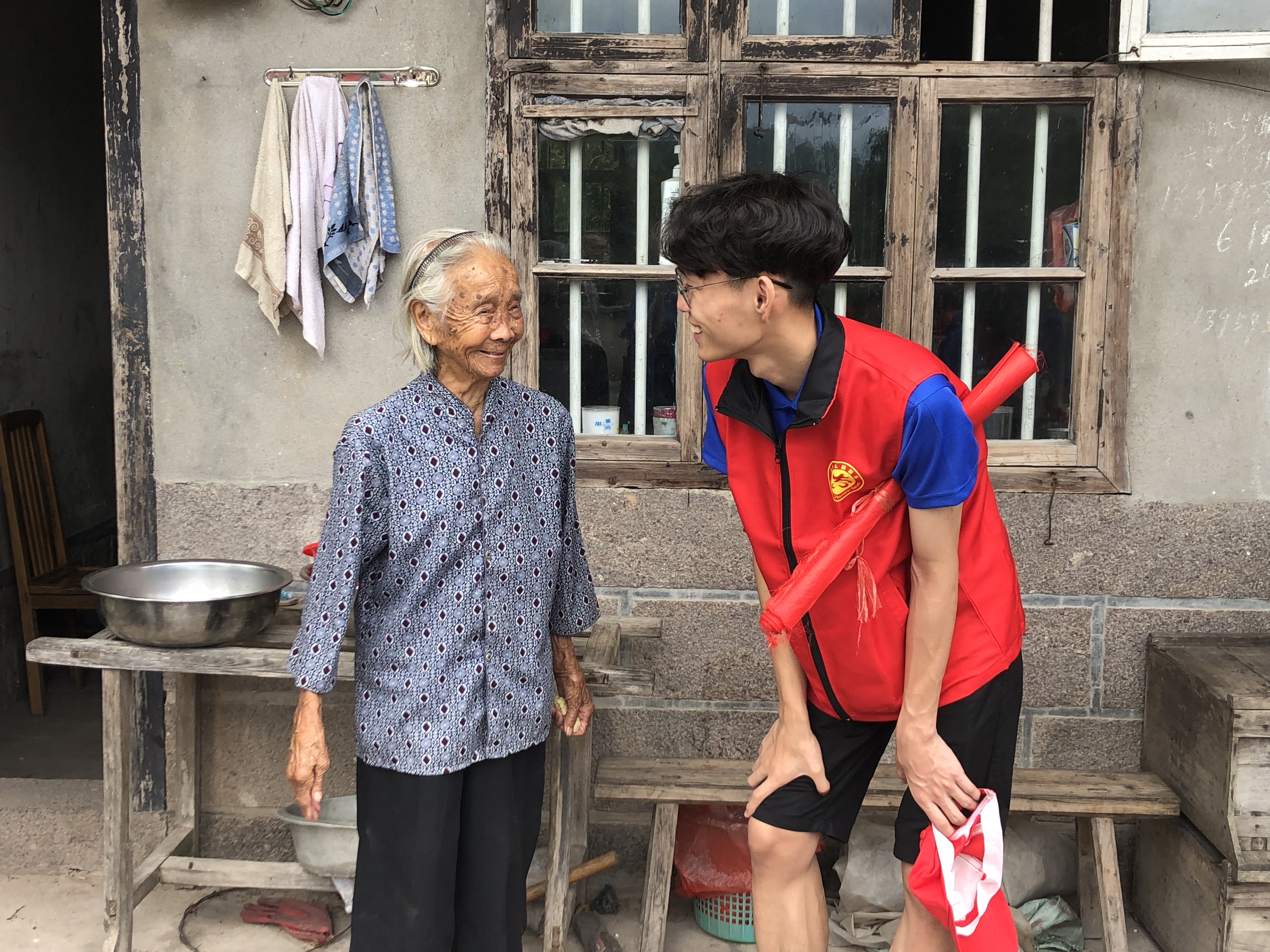 在负责人的带领下,实践队到达第二户贫困家庭。映入眼帘一处破旧的木房子,据村里负责人介绍,此户贫困人家为留守老人独立生活,儿子奔赴城市打工。与老人交谈中了解,老人91岁高龄,虽右眼失明,但身体硬朗,下地种菜普通食宿。老人一人生活,少有人问津,此次实践队到访,连连称谢。