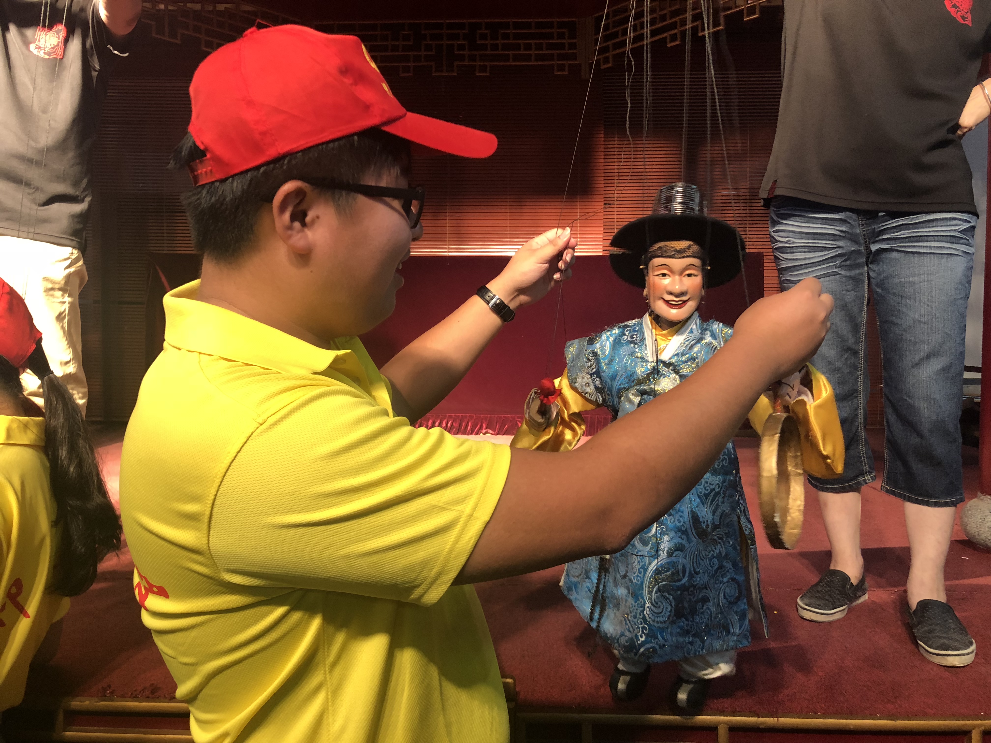 今天队员们共了解了三个节目,分别是《若兰行》、《钟馗醉酒》和《元宵乐》,大师赋予他手下的傀儡以生气、活力和灵气,他们精湛细腻的表演技巧,生动传神地让木偶变得栩栩如生,展现了泉州提线木偶的魅力。表演结束,队员们与木偶近距离接触,与表演者交流,实践队员跃跃欲试、进一步感受木偶提线技艺的奥妙。