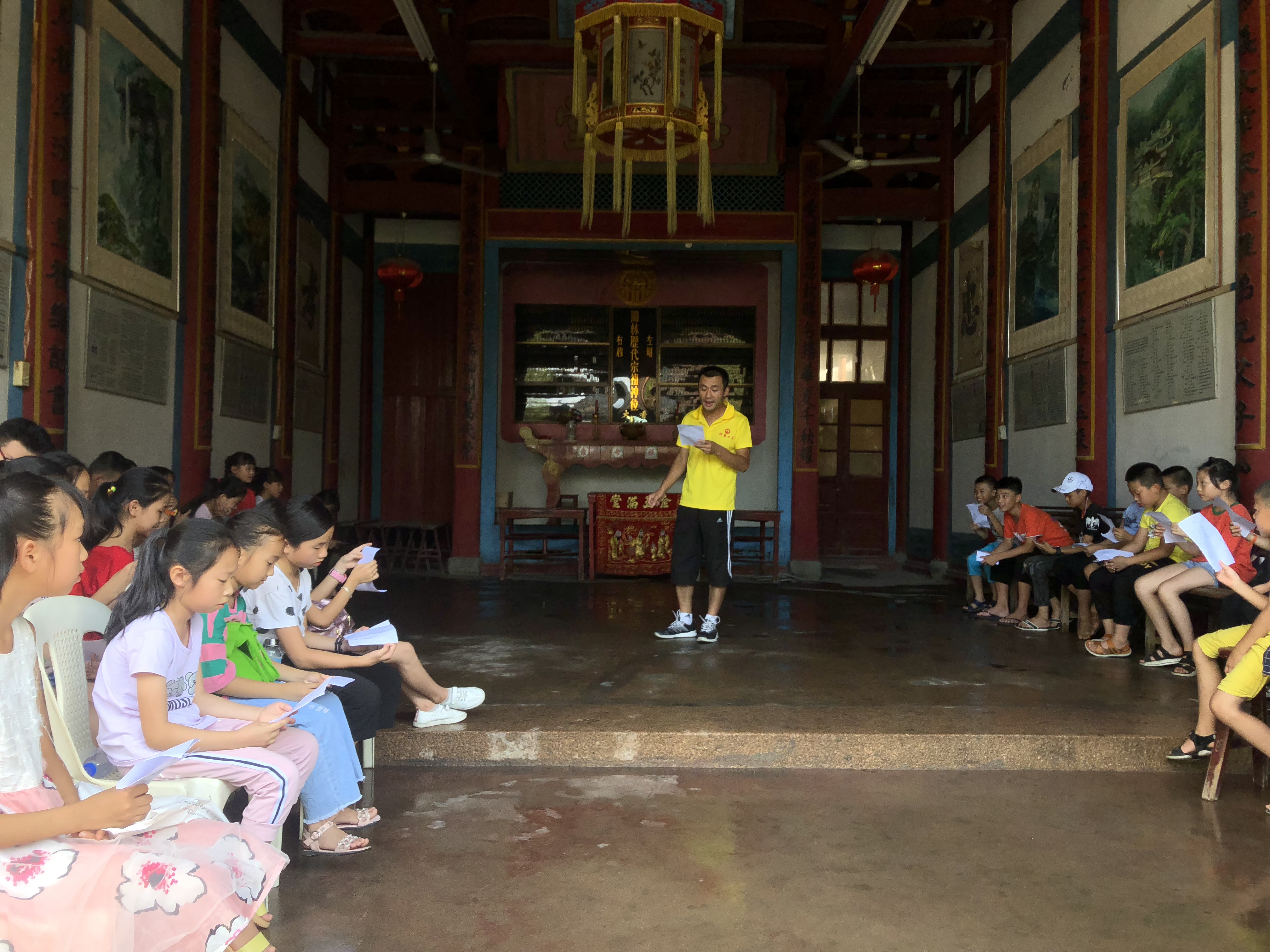 实践队兵分两路,一路的队员们为在图书馆的小学生们进行诗歌《海燕》的指导。队员们早早就为此次支教做了准备,事先参透文章主旨及内涵。教学过程中,从纠正咬字发音,到字句间的断句和抑扬顿挫,再到情感的注入与升华每个细节实践队员皆悉心教导、耐心讲解。另一路的队员们则来到林家祠堂,带领小学生们合唱《苔》。洪森原指导老师亲临现场,并带来专业性的指导意见。现场气氛融洽,欢笑声不断。