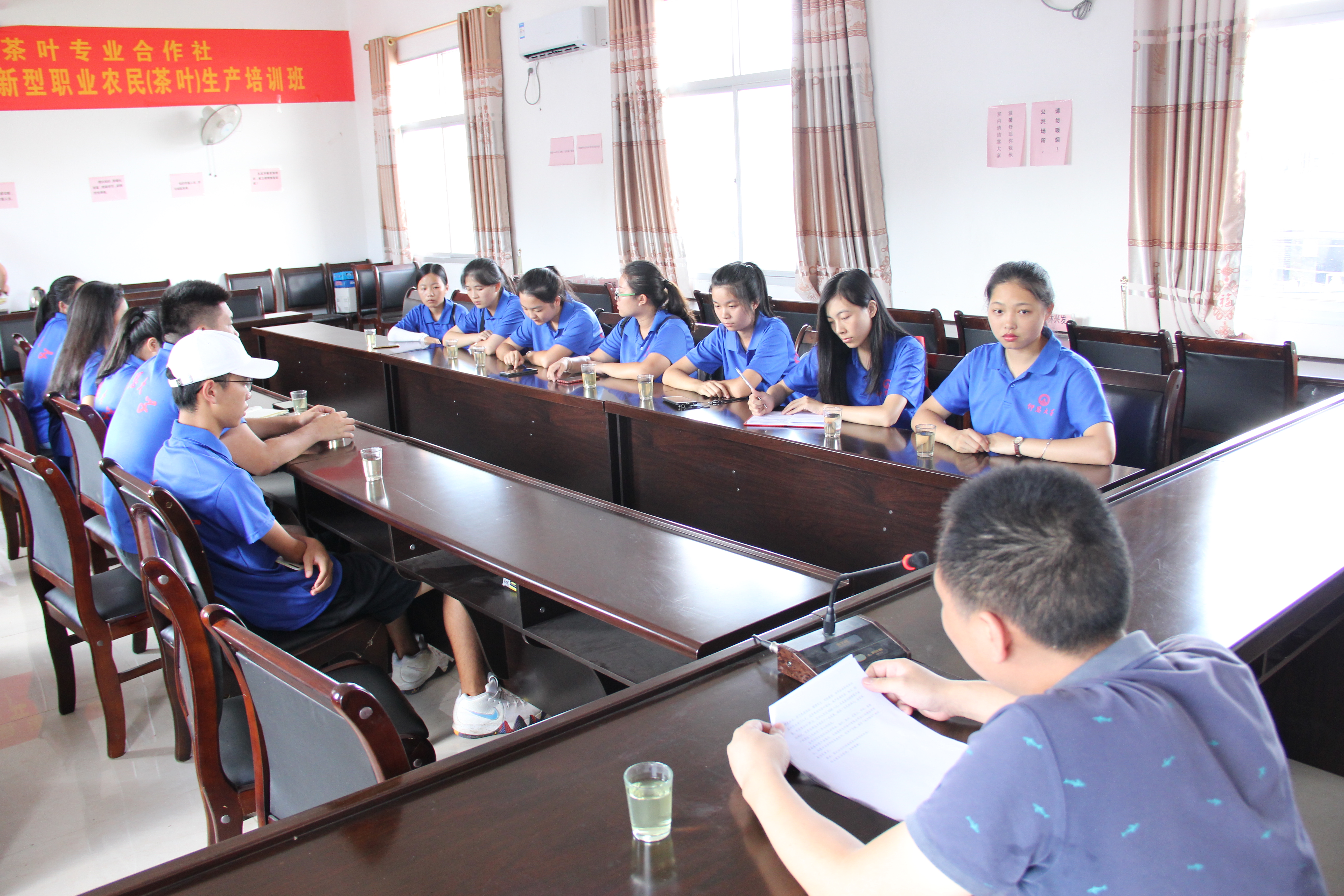 合作社理事长张文梁主任于会议室内与实践队员讲解合作社的基本概况。从“乡村振兴”的角度出发,张主任提到,目前合作社主要作为一个沟通交流的桥梁,会定期组织当地茶企负责人前往各地培训,并将其他地区先进的生产技术及管理模式引入本村,因地制宜地进行改善结合。同时,合作社会定期安排专业人员对当地茶农进行培训及指导。茶企和茶农共同合作,延长茶叶的产业链,节约资源,促进当地经济发展,助力“乡村振兴”。