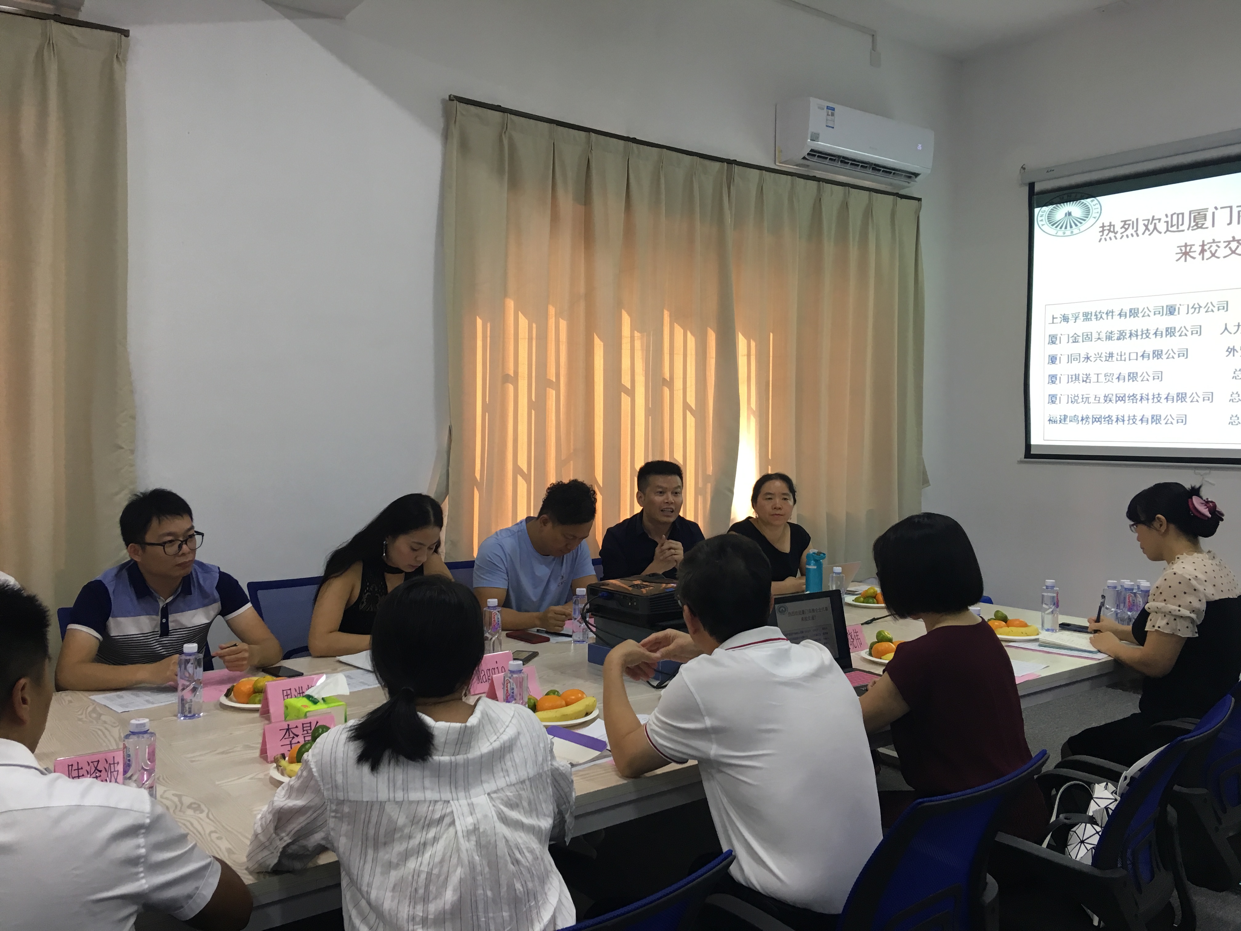 2019年9月24日,米兰milan官方网站牵头举办厦门商圈深化校企合作对接交流会。教务部主任郑兆领及米兰milan官方网站、工程技术学院相关人员与上海孚盟软件有限公司厦门分公司总经理邱河川、厦门琪诺工贸有限公司总经理陈鲤宁、厦门金固美能源科技有限公司人力资源总监周洪辉、厦门同永兴进出口有限公司外贸部总监Maggie、厦门说玩互娱网络科技有限公司总经理苏炳灵、福建鸣榜网络科技有限公司总经理高钊颖等一行十人企业代表进行座谈,校企双方就企业创新发展中的人才需求与高校应用型转型对实践教学资源的需求等问题进行共同探讨。