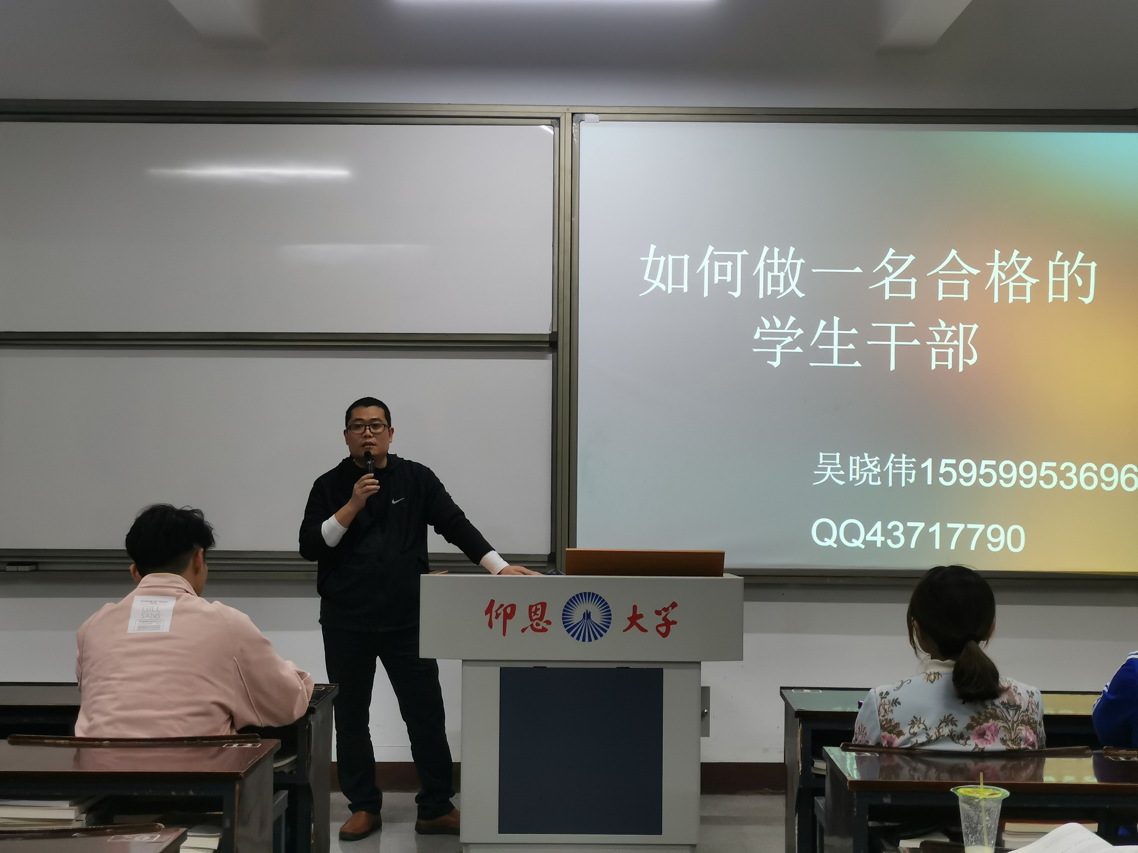 培训会开始,吴晓伟首先阐述了学生干部的定位,学生干部是学生群体骨干分子和中坚力量,是学校同学生沟通的桥梁和纽带,是学院管理工作系统中的一支重要力量。随后,吴晓伟从“德”、“能”、“勤”、“绩”这四个方面全面剖析了怎样当好一名学生干部,强调了作为学生干部应该要有更高的思想觉悟和良好的道德品质,并且在工作中能够不断地加强组织协调能力、表达能力、社交能力、收集处理信息的能力以及创新能力,养成雷厉风行、勤奋务实的工作作风,并以做出成果为工作导向。紧接着,他还从思想、制度、行动三个方面介绍了如何培养优秀的学生干部,具体讲解了举办一场活动前期、中期、后期三个不同时间段的工作流程及注意事项,强调了学生干部要在做中学,学中做。最后,吴晓伟指出,当代大学生作为学生干部,要学习并掌握如何处理好同老师、同学、工作伙伴之间的关系,协调好学习与工作、个人与集体的关系,并就此分享了正确对待得与失的经验与心得。