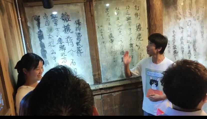活动过程中,实践队通过担任博物馆解说员介绍红军标语,不仅有利的宣传了其中蕴含的红色文化,更使自身对马洪村中央红军历史有了进一步的了解。从红军标语到二十九位将军像,队员们带领游客共同体会历经战火硝烟洗礼仍能保存至今的红军精神。担任讲解员的实践队队长周佳贤向游客们说到:“在这片红色的土地上,中国工农红军建立了苏维埃红色政权,留下了可歌可泣的斗争故事,作为新一代的青年人,我们应该传播红色文化,传承红色精神,唱响‘风展红旗如画’。”