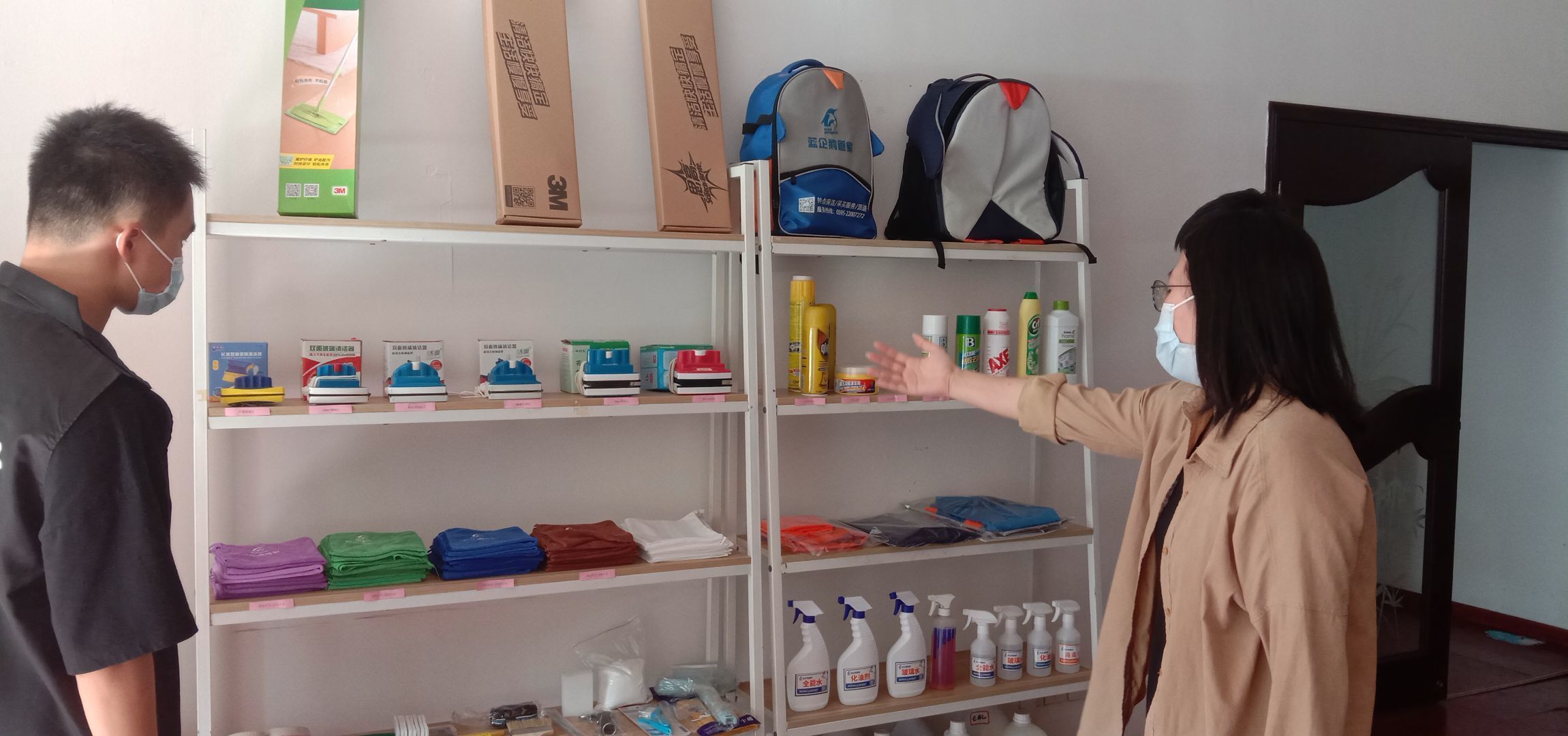 图1公司职员王梅兰向实践队介绍家政服务业所需工具