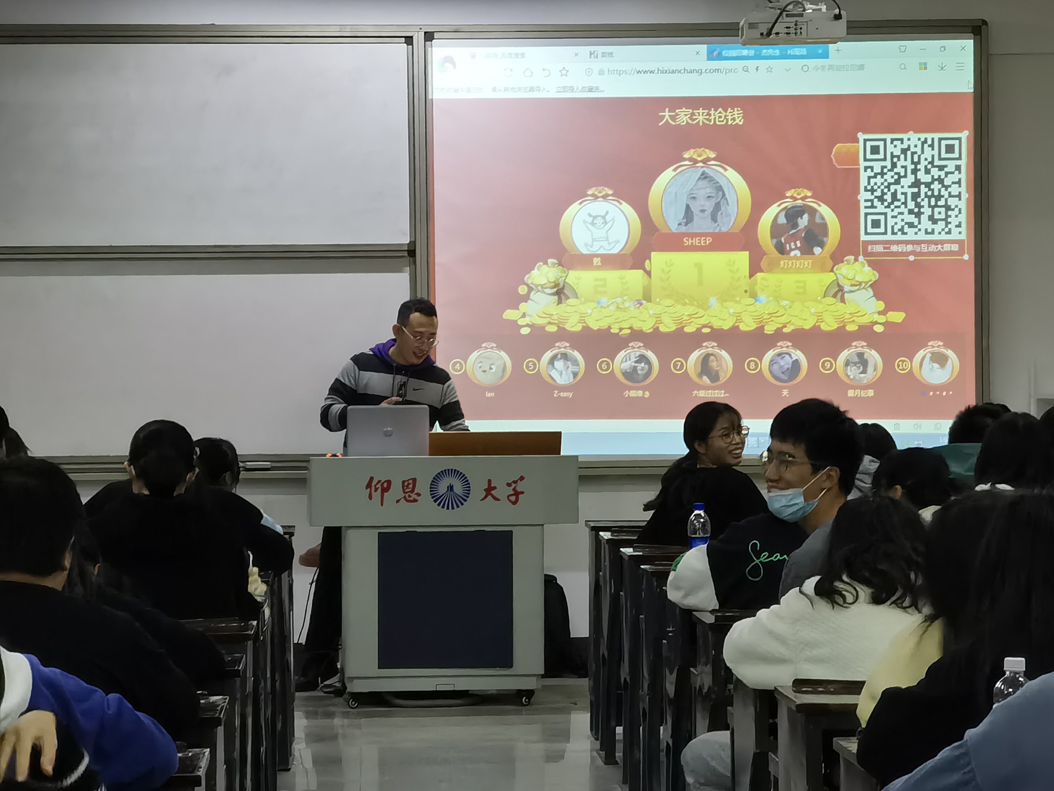 图3 宣讲会进行中 首先,在宣讲会正式开始之前,主持人带领同学们玩了个小游戏,活跃了现场的气氛。其次,由中国人寿高级部经理兼三星级讲师叶谋前热情地介绍保险这一行业,随后介绍了人寿公司近年的发展状况和突出优势,并结合自身经历分享了个人的所学所得,最后说明了中国人寿公司员工薪资情况且诚挚地欢迎大四毕业生积极去应聘,屏幕上的薪资及公司福利无不吸引着同学们的眼球,相信同学们一定会积极争取机会!