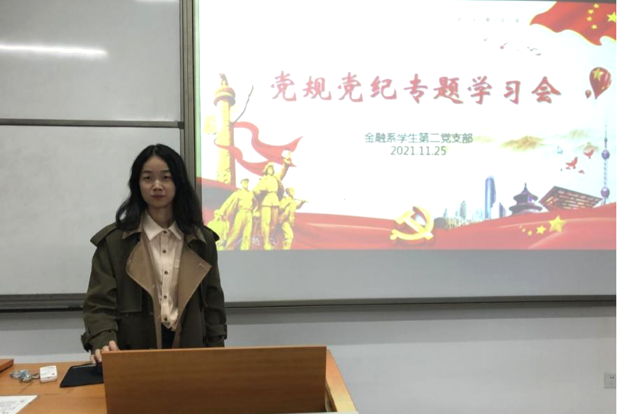 图2 讲解廉洁自律准则 学习党章党规觉纪,其次要了解党规党纪的主要内容。一是《中国共产党章程》。目前,我们党已形成了包括政治纪律、组织纪律、经济工作纪律、群众工作纪律在内的比较完整的纪律体系。各支部立足于《党章》,重新认识党员的义务和权利,强化对党的组织制度的归属感,强调基层党组织的战斗堡垒作用,深化对党的纪律的学习和理解,维护党章权威,把党规党纪铭记于心。二是具体的党纪党规,通过解读法纪内涵,将精神实质领会于脑。通过学习《中国共产党纪律处分条例》,强化政治纪律、组织纪律、廉洁纪律、群众纪律、工作纪律和生活纪律等意识,了解相关处分条例。在重点学习《中共共产党党内监督条例》中,了解党内监督主要内容,强调要遵党章、守党规,坚定理想信念,坚守共产党员的初心,践行党的宗旨,牢记党的使命担当,严肃党的纪律,推进党风建设,加强作风建设,严格落实从严治党,将中央八项精神落到实处。在学习中进一步领悟《中共共产党党内监督条例》的实行,对于坚持党要管党、从严治党的方针,发展党内民主,加强党内监督,维护党的团结统一,保持党的先进性,始终做到立党为公、执政为民,将起到重要作用及意义。最后,通过分析中央纪委国家监委公开通报六起违反中央八项规定精神典型问题,和福建省纪委监委通报4起群众身边腐败和不正之风问题典型案例,以人为镜,以史为鉴,强调《中国共产党廉洁自律准则》,强调作为共产党员必须坚守的“四个坚持”,作为党员干部必须做到的“四个廉洁、四个自觉”。