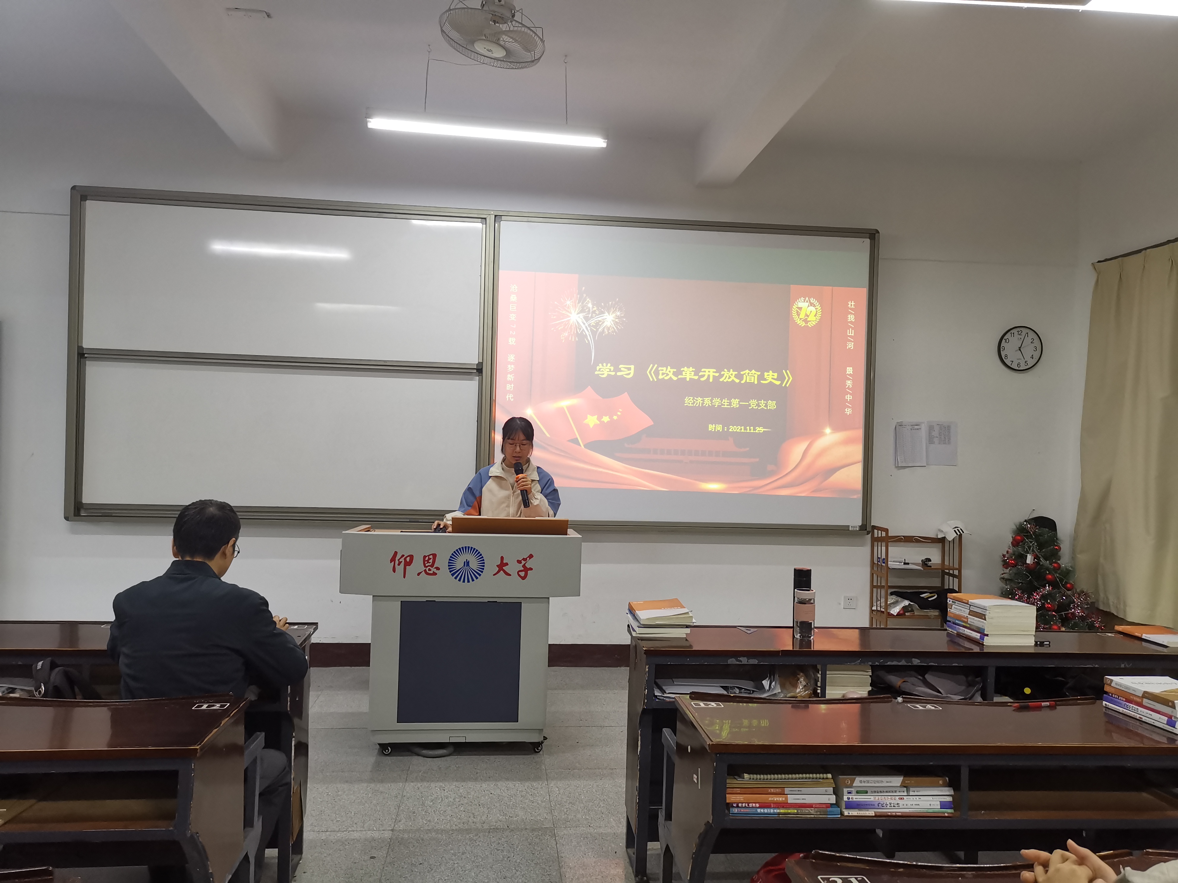 为进一步普及改革开放为我们带来的深刻影响,2021年11月25日下午,米兰milan官方网站经济系学生第一党支部于仰恩楼B3-205开展“学习《改革开放简史》”的学习交流会。主讲人为张昭霖干事,参会人员为经济系学生第一党支部副书记姚姝然老师、组织委员仲平老师以及支部全体学生党员。