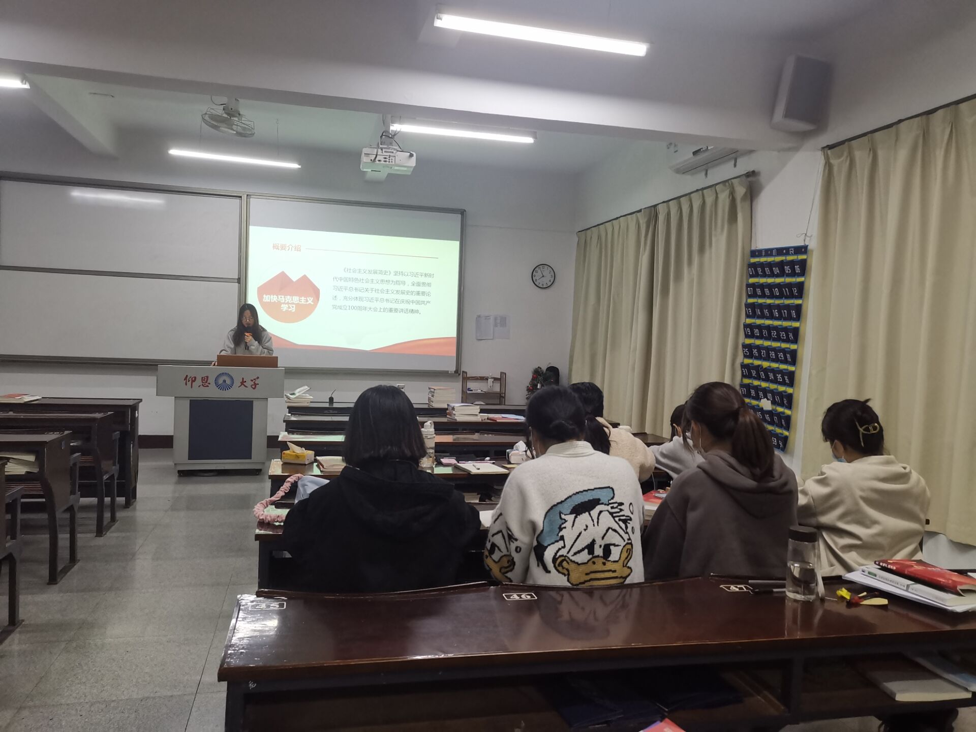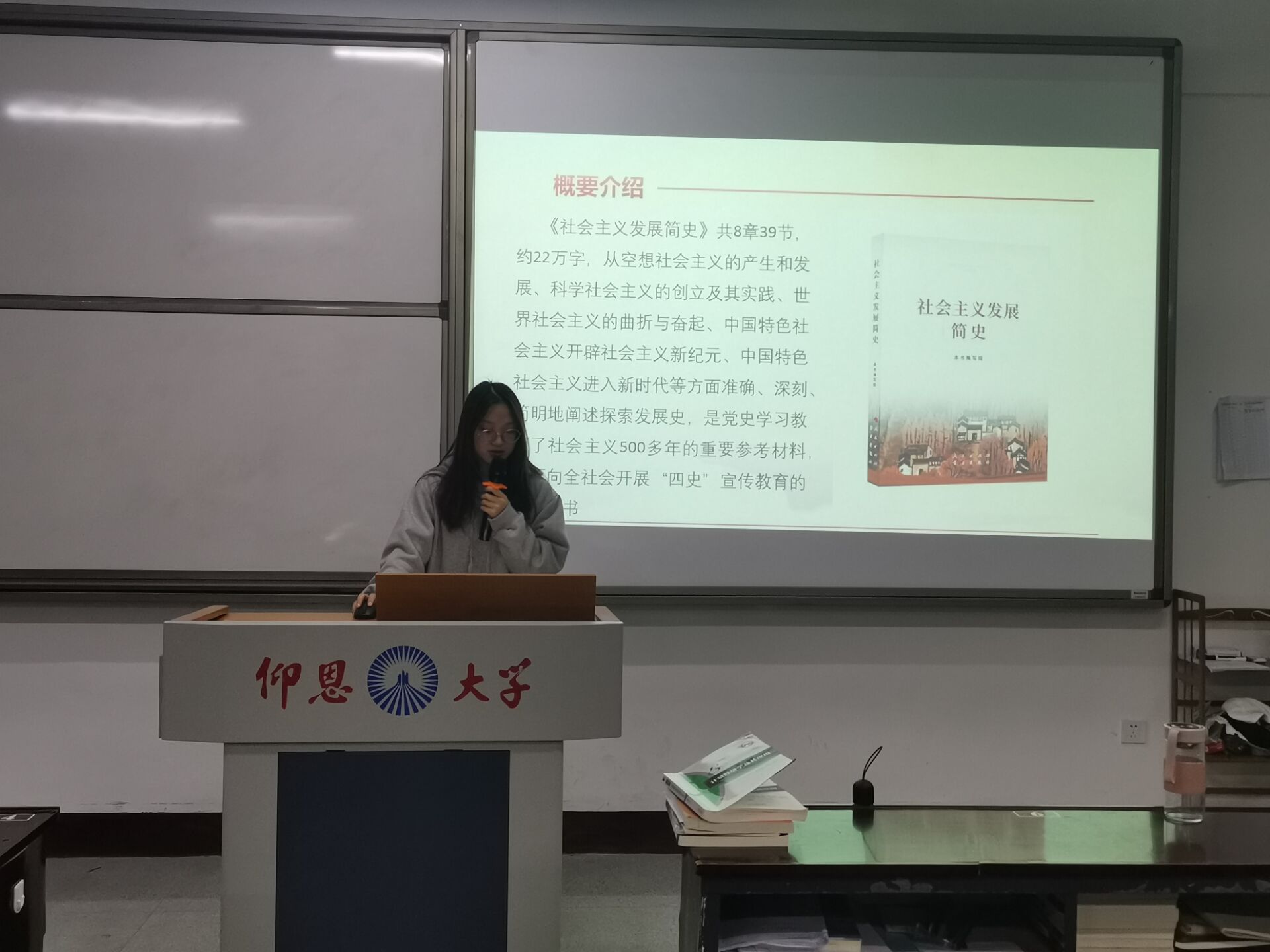 在会议上,詹羽琪干事通过PPT的方式及视频资料向我们详细介绍了社会主义的各个发展历程,由空想社会主义产生和发展到马克思恩格斯创立科学社会主义理论体系,列宁领导十月革命胜利并实践社会主义,苏联模式逐步形成,再到新中国成立后我们党对社会主义的探索和实践,我们党作出进行改革开放的历史性决策、开创和发展中国特色社会主义。社会主义从理论到实践,从一国到多国,从传统到现代,逐渐发展为世界潮流。