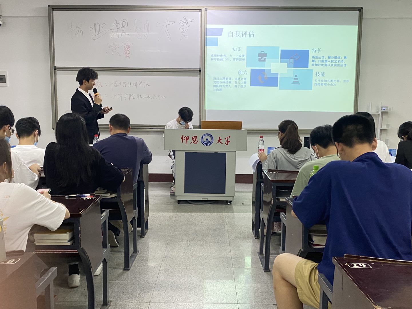 图1 比赛现场 决赛分为选手个人PPT展示和现场答辩两个环节。在比赛过程中,参赛选手们通过展示各自精心准备的PPT、策划书详细地讲述了对自我的评估、对当今校园、社会的环境分析、未来的职业发展规划及实施计划等,并表示在日后的学习实践过程中会更加的努力,弥补自身不足,明确定位自己的发展方向,发掘自身潜能,提高自己的就业竞争力和综合素质。比赛评分由现场老师担任评委进行打分,老师们也会向参赛选手们提出职业生涯规划书中优秀之处以及需要改进的地方。在此次大赛中,选手们自信大方的表现,条理清晰的展示及精彩的答辩,让观众席上的每一位同学也受益颇多。决赛角逐出一名一等奖,两名二等奖,三名三等奖以及三名优秀奖。最后,大赛在一片热烈的掌声中落下帷幕。