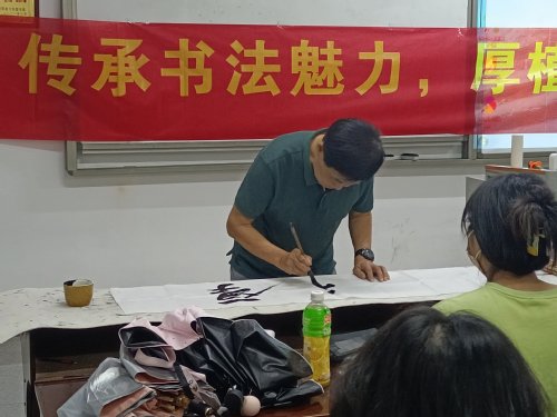首先,学校书法社老师宋浩给我们讲述了他过去学习书法的历程。他认为学习书法是一种乐趣、一种享受。然后给我们介绍了一些书法工具,在介绍过程中,大家慢慢地都对书法开始好奇、憧憬起来,也让大家都对书法有了更深一层的了解。接着,宋浩老师为大家示范,写了一幅“厚德载物”,在写的过程中,老师也边教大家去注意一些细节以及如何去体现每一个字的艺术性。在这一过程中,相信大家也感受到了书法的魅力和书法的独特风格。最后,宋浩老师与书法作品以及活动人员拍照留念。