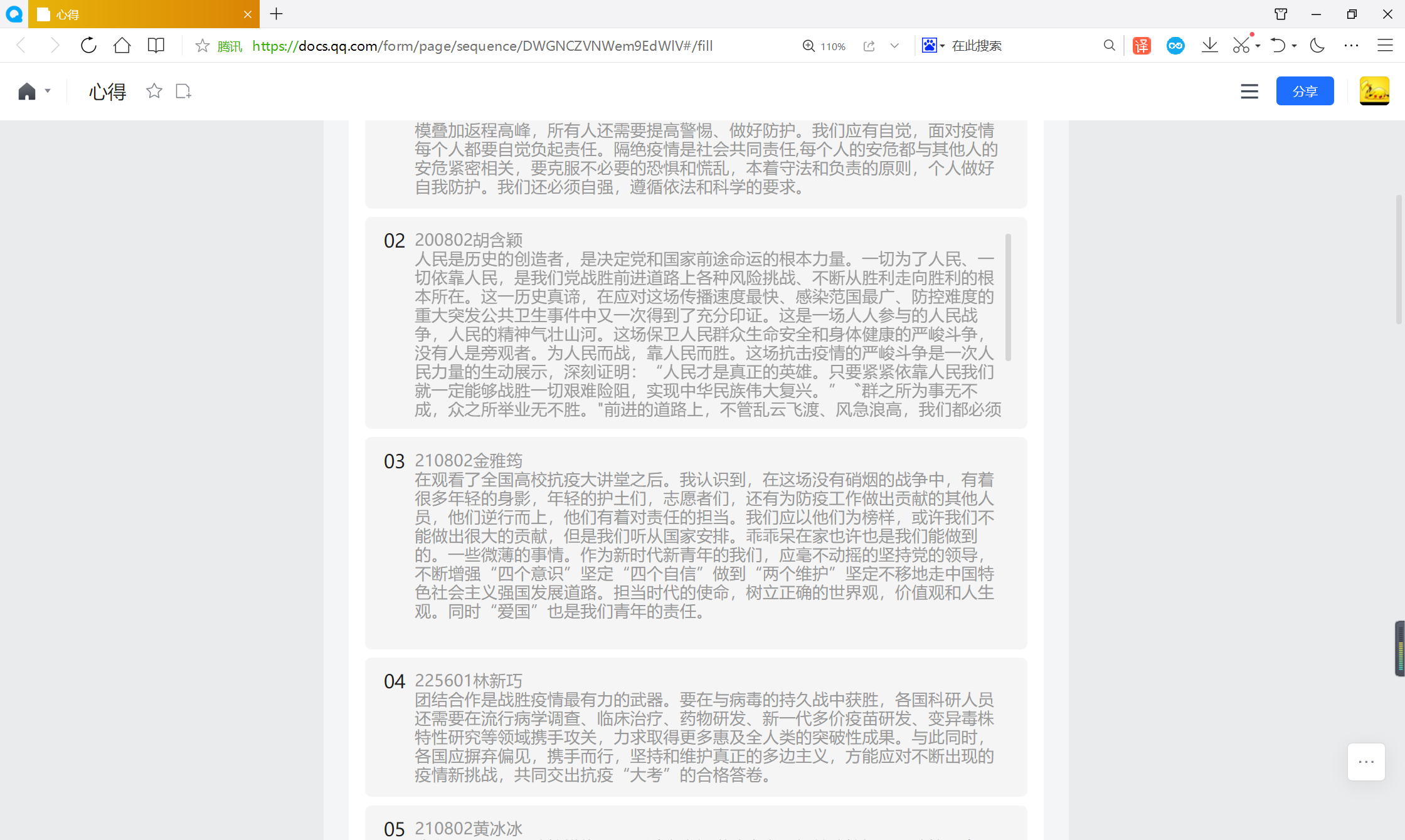 课后,我院教工支部各位同志也都纷纷发言讨论,都表明要以更严格的标准要求自己。做好科学防疫工作,不给党不给国家添麻烦。党员干部要做好疫情防控的宣传,让更多人对“打疫苗”有科学的认识,自觉打“第一针、第二针、第三针”,构筑起健康免疫系统。疫情防控,人人有责,精准高效做好疫情防控工作,离不开全体成员的共同参与,每个人都应当本着为社会、为自己、为家庭负责的态度,积极落实好各项防控措施,当好自身疫情防控“第一责任人”,通过每个人的努力,凝聚成群防群控的强大力量。(米兰milan官方网站党总支 黄培真/图文)