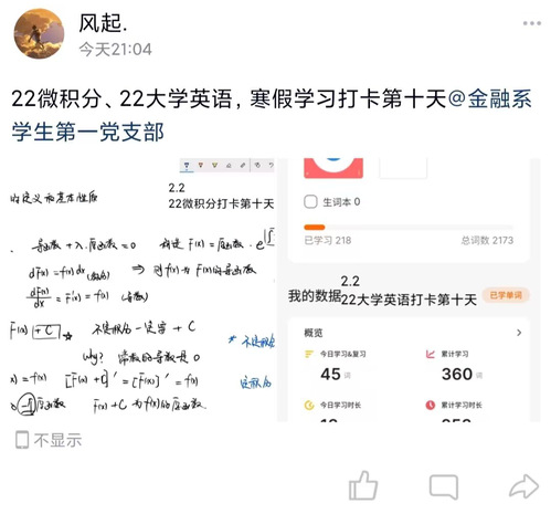 此次学习打卡活动采取QQ空间打卡形式,引导同学们在寒假期间坚持学习,养成每日学习的好习惯。在同学们的日常打卡内容中,包含大学英语、概率论与数理统计、微积分等专业课的复习内容,晒出了每日学习一小时的软件录播课、学习笔记等内容。同时,为了保证打卡活动的质量,支部安排每科一名团长,每日在群里分享知识点,提供考试提纲相关的题目解答,努力为同学们创造良好的学习氛围。