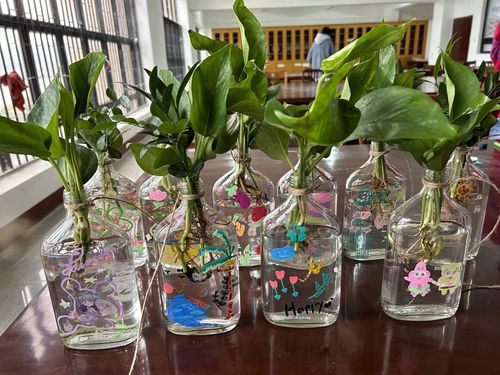 本次活动通过事先收集废旧玻璃瓶,并提前准备好画笔、麻绳、绿萝等以装点玻璃瓶。活动现场,支部同学各自分组,进行绘图构思,在废旧玻璃瓶上作创作画,将废旧玻璃瓶变废为宝,变为精美的花瓶,赋予其第二次生命。环保与公益的相结合,让废旧玻璃瓶折射出新的光彩。