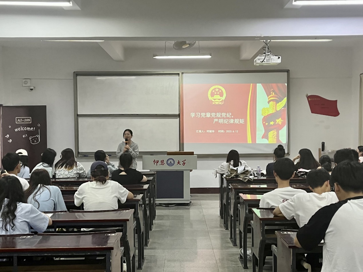 为学习领会党的二十大关于全面从严治党重大决策部署,深入落实习近平总书记关于严守党章党规党纪的重要论述和重要指示精神,2023年06月12日下午5:20,金融系学生第一党支部在仰恩楼A1-105开展了党章党规党纪专题党课。此次党课由我院金融一支支部书记何丽玲老师主讲。支部全体党员及各班积极分子代表参加了此次党课学习。