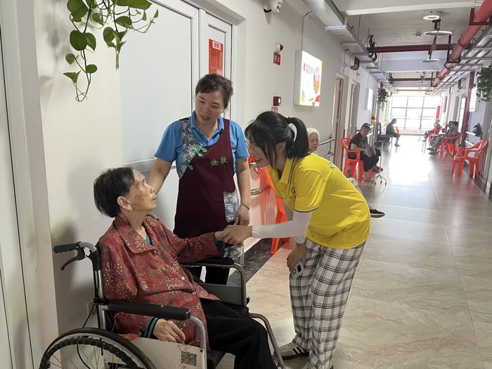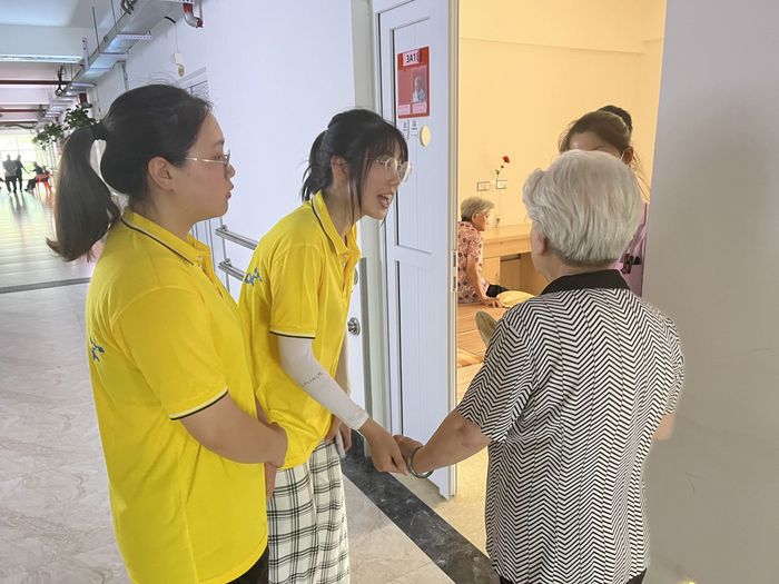 在养老院工作人员的带领下,实践队员走访了整个养老院,详细了解了养老院的基本情况和院内老人们的生活起居以及身体健康状况。随后,实践队分成四组分别到各个楼层陪伴老人们,与他们亲切交谈,队员们认真倾听每位老人讲述在他们身上发生的故事和特别的经历,整个楼道内都是老人们的欢声笑语。