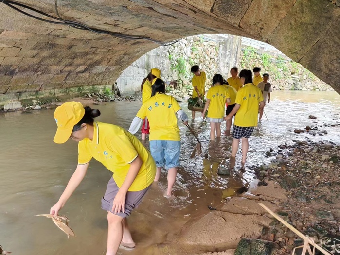 助力河流治理,让河长制“活起来。河长指导实践队成员下河,运用所学的水域环境保护知识,对桥下河滩的垃圾和杂草进行清理。通过此次环保净滩活动,实践队成员有效地提高了自身的实践能力,同时也深刻领悟了新时代大学生的初心和使命,努力为建设美丽中国贡献青春力量。