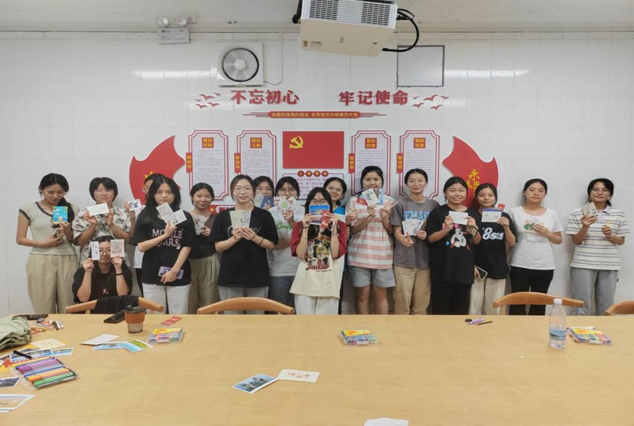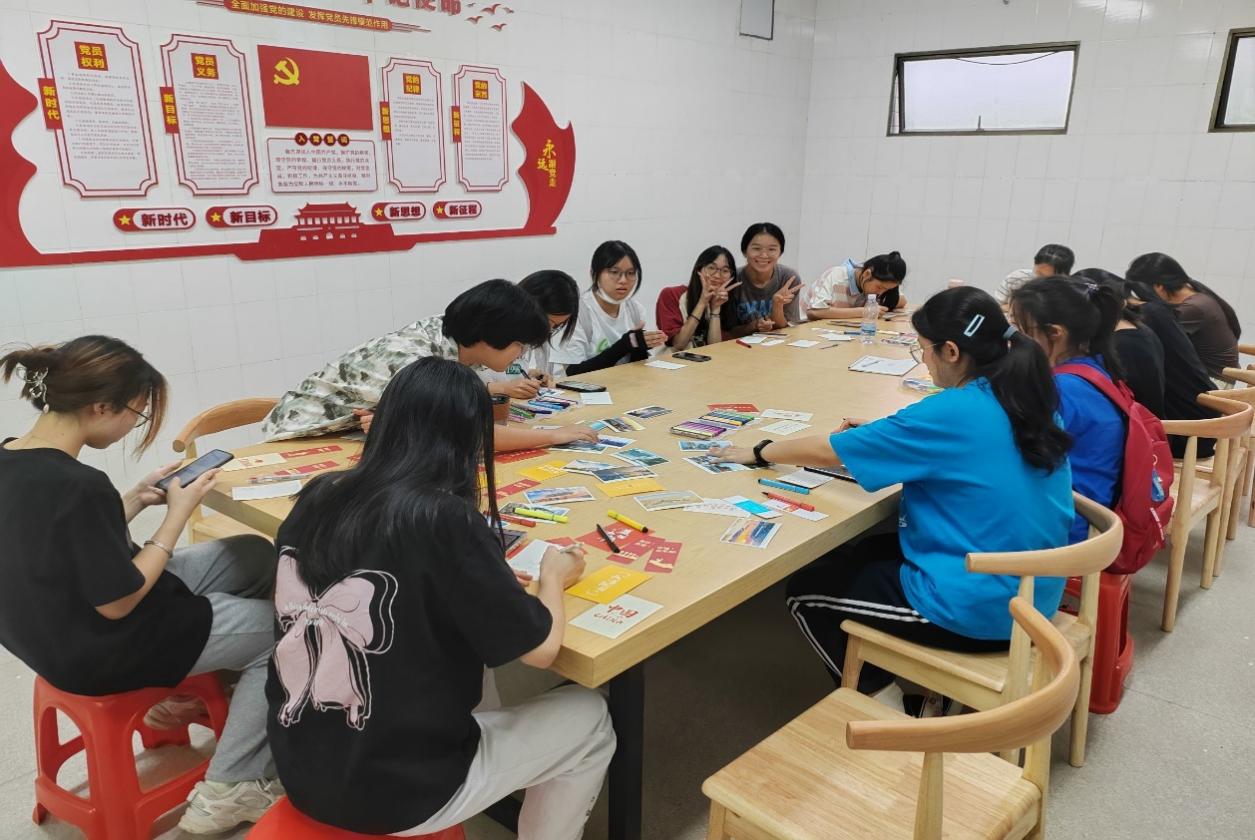 活动开始,负责人分发了明信片、书签和水彩笔,介绍了此次活动的重要意义和流程。各位同学积极响应,发挥自己的创意,以爱国为底色,开始绘制自己心中的“祖国印象”。一张张明信片、一个个书签承载着特色的中华文化,展现了同学们对祖国的热爱和祝福。何丽玲老师记录了同学们沉浸创作时热情认真的身影和喜悦的笑容,增进了与同学们的交流和感情,加强了支部的凝聚力。最后,大家相互展示自己的创意作品,分享成功的喜悦。每张明信片都是同学们对祖国的赞美和热爱,也是大家无声的告白。