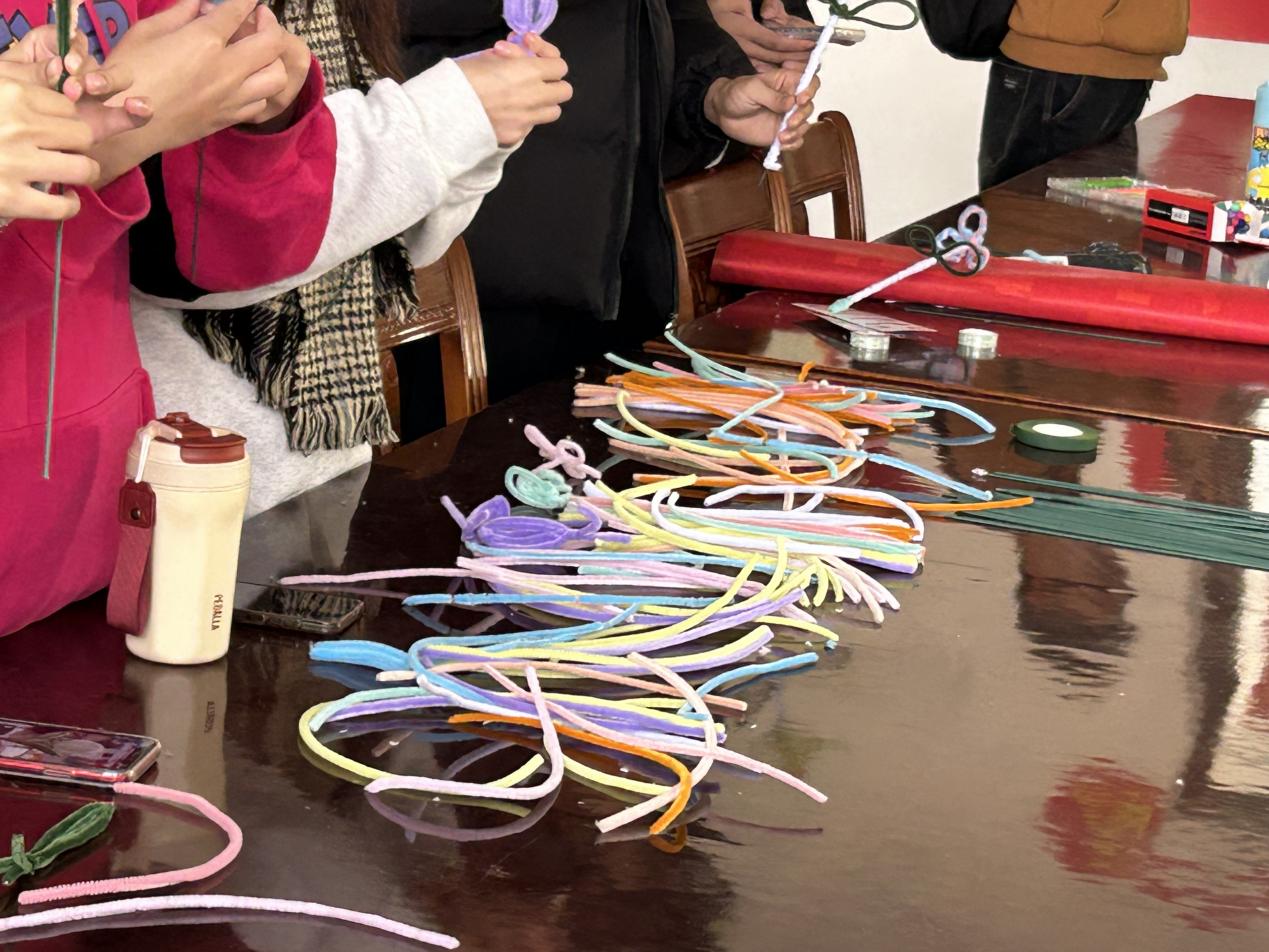 以文化人,以艺通心,支部同学在事先准备好的花束包装纸上进行精心涂鸦,提笔画世界,为“鲜花”制作做铺垫。为进一步贯彻生态环保理念,支部用扭扭棒替代传统鲜花,以别具匠心的手工将朴素的材料变为永不凋零的“鲜花”,并将二者融为一体,形成一束束独具一格的花束。