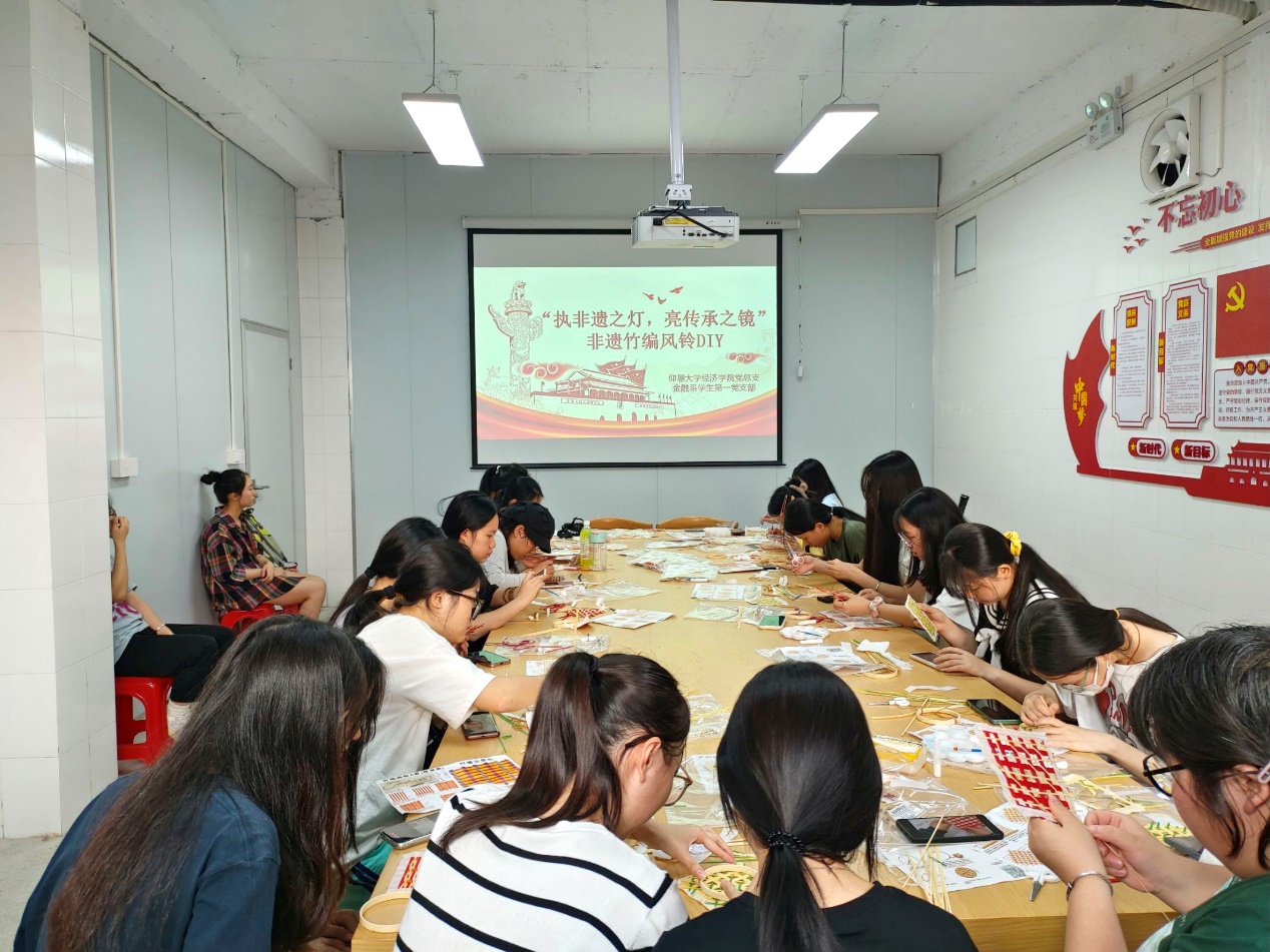图1 同学们在党员活动室内进行非遗竹编风铃DIY