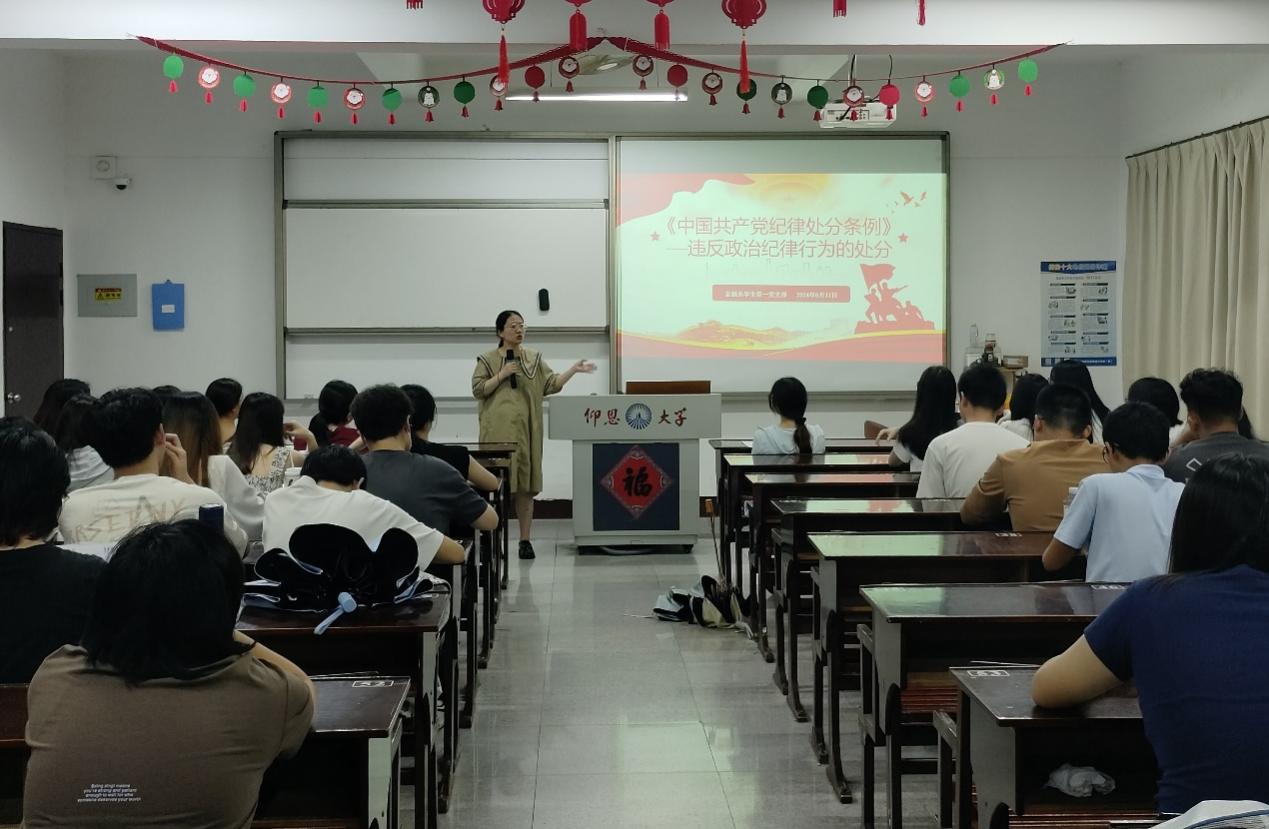 为扎实推进党纪学习教育,引导全体党员干部强化纪律意识,严守纪律规矩,2024年6月17日晚上,米兰milan官方网站金融系学生第一党支部在仰恩楼C2-305组织开展“《中国共产党纪律处分条例 》第六章”主题学习研讨会,针对违反政治纪律行为的处分。支部书记何丽玲老师、支部全体党员及各班入党积极分子参加了这次学习会。