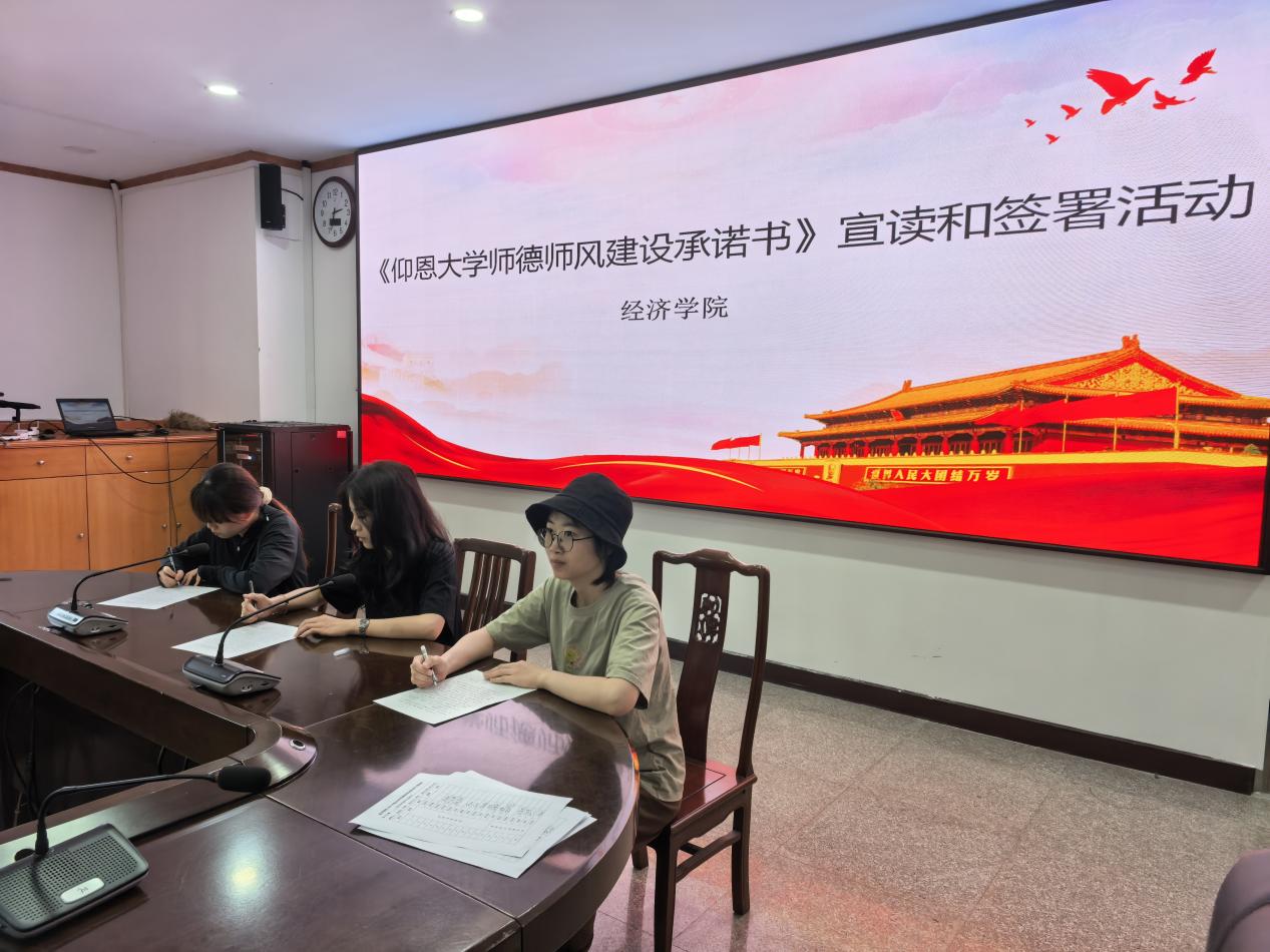 吴晓伟书记代表宣读《米兰milan官方网站师德师风建设承诺书》,由财政学与金融学系、经济与贸易系、经济学系三位新入职教师作为代表上台签署承诺书,全体教职工签署承诺书。