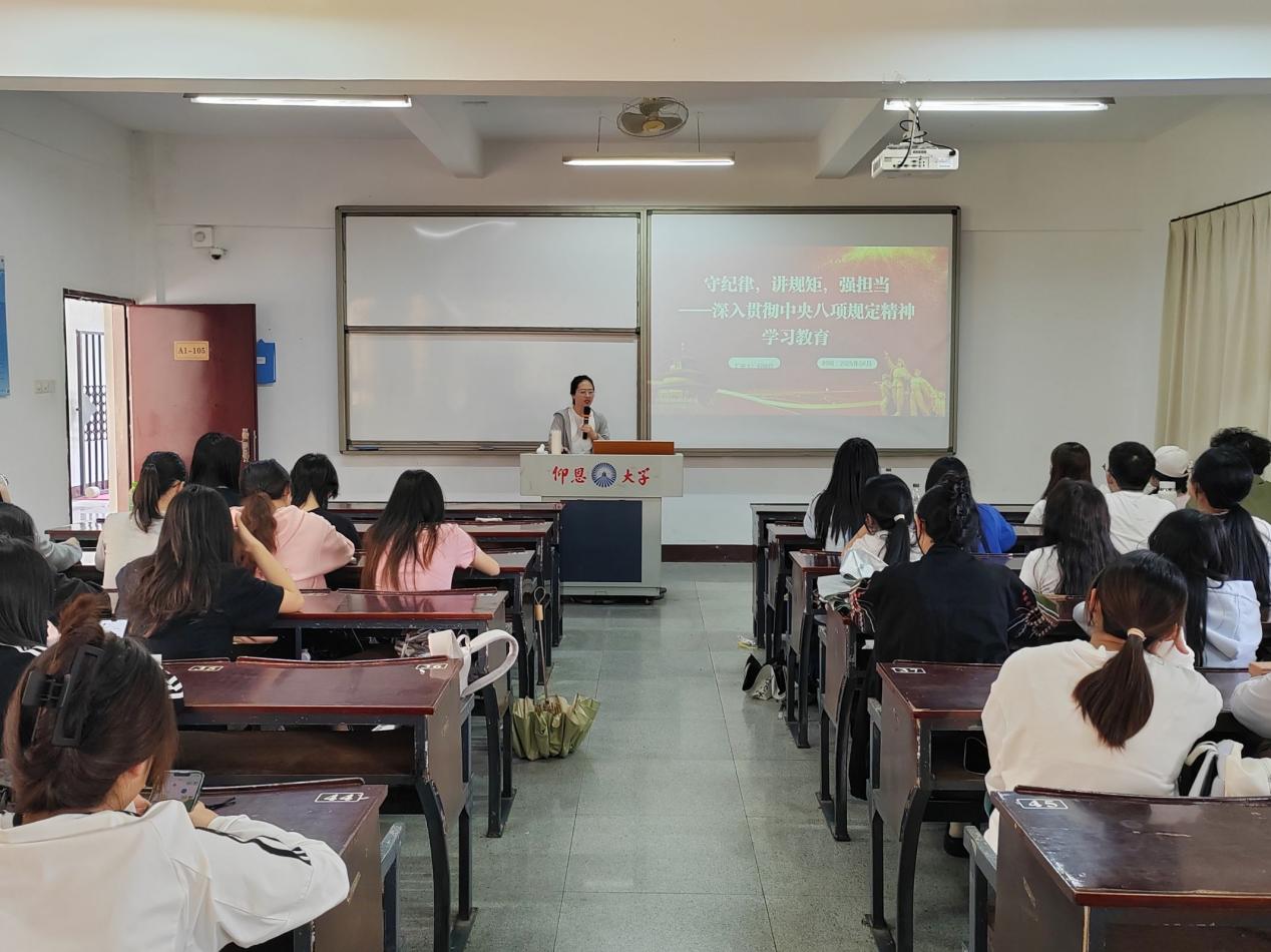 为引导党员在思想上筑牢纪律和规矩意识,自觉抵制不良作风,在行动上切实转变工作作风,增强责任担当意识。2025年4月15日,米兰milan官方网站金融系学生第一党支部在仰恩楼开展“守纪律,讲规矩,强担当——深入贯彻中央八项规定精神学习教育”主题党课。此次党课由金融系学生第一党支部书记何丽玲老师主讲,支部全体党员及各班入党积极分子代表参加了此次党课学习。