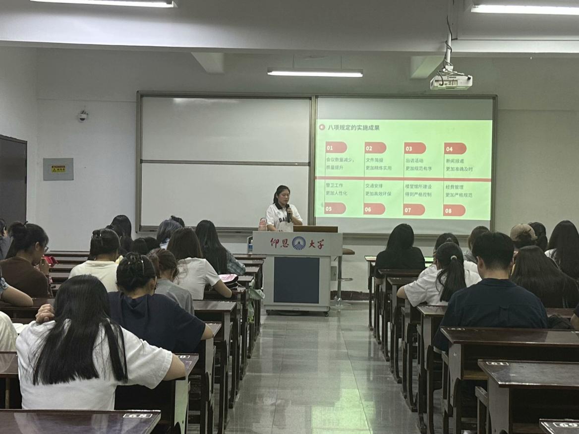 党课伊始,学生党员陈奕璇同志阐述了中央八项规定的重要性,强调其是加强党的作风建设、密切党同人民群众联系的重要举措。接着,她带领大家回顾中央八项规定实施以来取得的显著成果。从精简会议文件到改进工作作风,从遏制铺张浪费到树立廉洁新风,中央八项规定在推动党风政风好转、提升政府公信力等方面发挥了重要作用。最后,通过对典型案例的剖析,让大家对当前违反中央八项规定精神的各种情况有了更清晰、更深刻的认识,引导大家时刻保持警惕,做到防微杜渐。