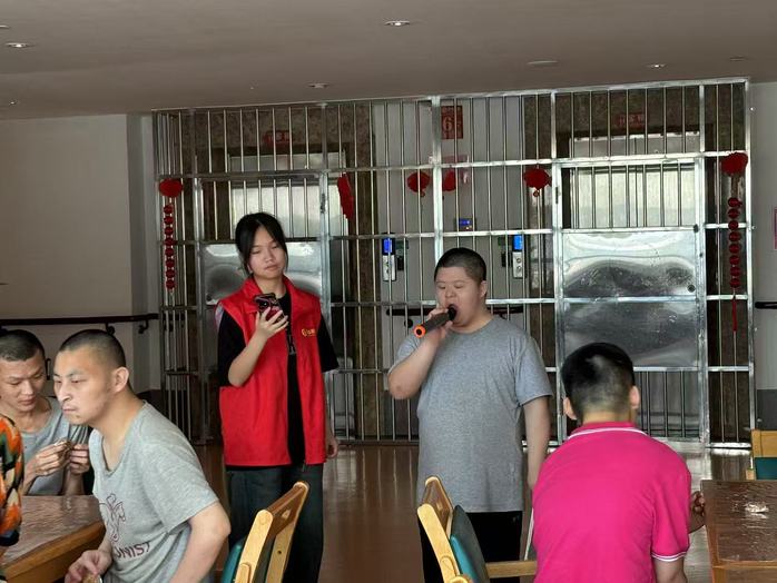 紧接着队员们带领残障青年们合唱他们熟悉的歌曲,队员们与他们眼神交汇、笑容传递,感受他们对生活的热爱,歌声里满是对残障青年的关怀。