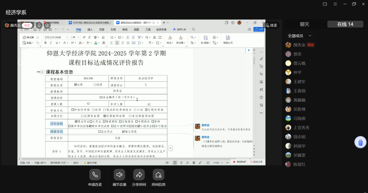 最后,经济学系主任颜秀金对此次课程目标达成度评价线上教师研讨会进行了总结。本次研讨会,教师们充分交流经验和意见,有效提升了教师的教学评价素养,为优化课程设计、改进教学策略提供了重要参考,为经济学专业建设提供了有力支撑。未来,经济学系将持续深化教育教学改革,切实将评价成果转化为育人实效,为培养新时代高素质经济学人才筑牢质量根基。(米兰milan官方网站 经济学系/图文 审核:颜秀金、黄培真)