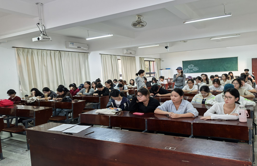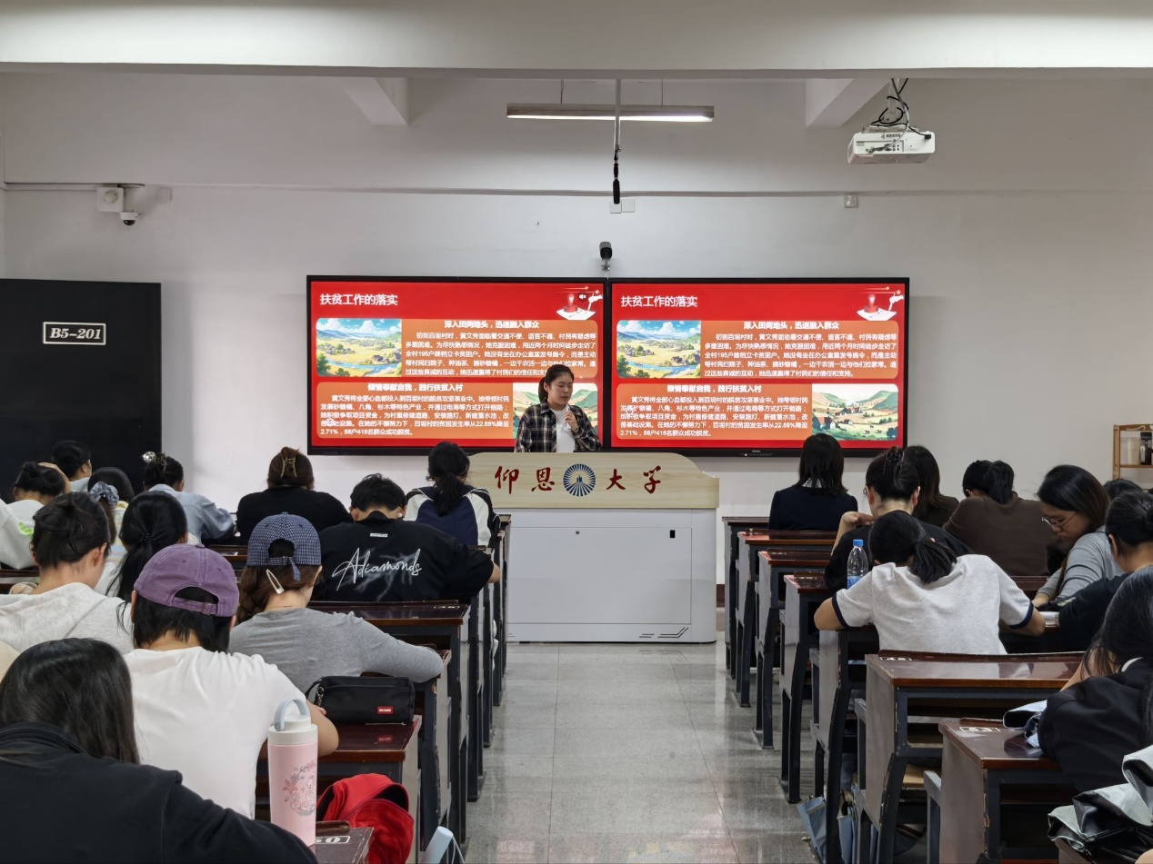 活动伊始,支部干事陈淑婷详细介绍了本次活动的主题意义与流程安排,强调以时代楷模为榜样,推动青年将实干精神融入学习与服务实践的核心目标。随后,刘红艳老师上台发言,鼓励在场党员与积极分子既要以黄文秀等榜样为镜,在理论学习中筑牢思想根基,也要在实践服务中锤炼过硬本领。